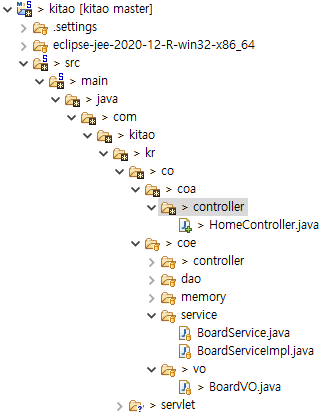 위치는 보통 com/kitao/kr 까지만 생성되있을 껀데, 본인은 구분을 쉽게하기 위해 co, coa 까지 생성해 주었다.